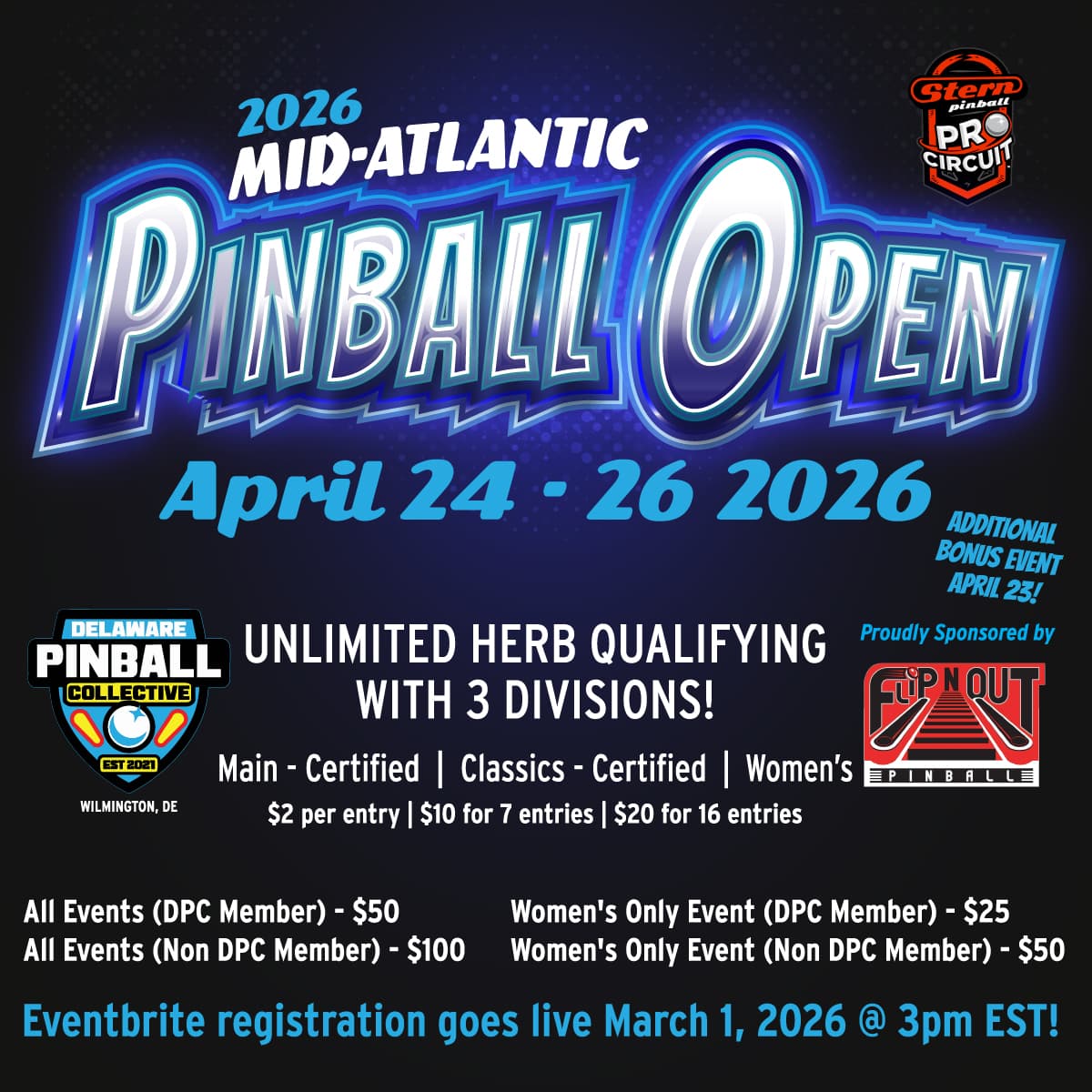The Delaware Pinball Collective is excited to announce that in 2026 we will be making our debut on the Stern Pro Circuit Tour! The 2026 Mid-Atlantic Open has been selected to host the Stern Pro Circuit during the weekend of April 23rd to the 26th! We are super excited for this opportunity and we look forward to bringing you a lavish event that you won’t want to miss, so mark your calendars now! Full event details are still be ironed out, but we will have a full announcement no later than December 15th! Stay tuned and start making your reservations now! This will be the second best day of your life!