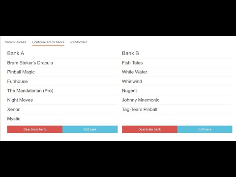 You don’t want banks. Do not do “Banks”. Under arenas, go into each individual machine and give it a category, A or B. Set tournament up for matchplay, single game per round. Then as posted above by Corey, when you start a round, hit the dropdown box and choose to draw from A or B arenas.