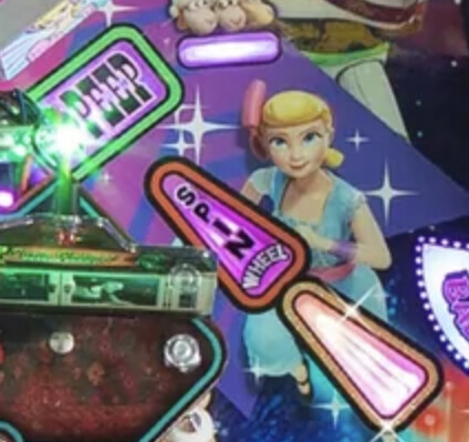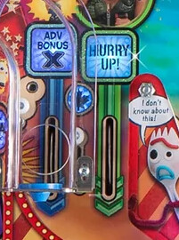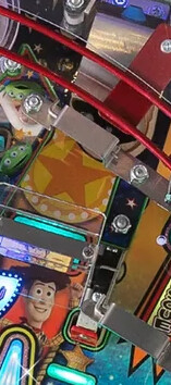 This saucer holds the ball at the end of the right spinner shot, where Woody appears on the playfield. At the start of the ball, you’ll see “Skill Shot” blinking next to this saucer, and you can try to plunge the ball lightly into it.
