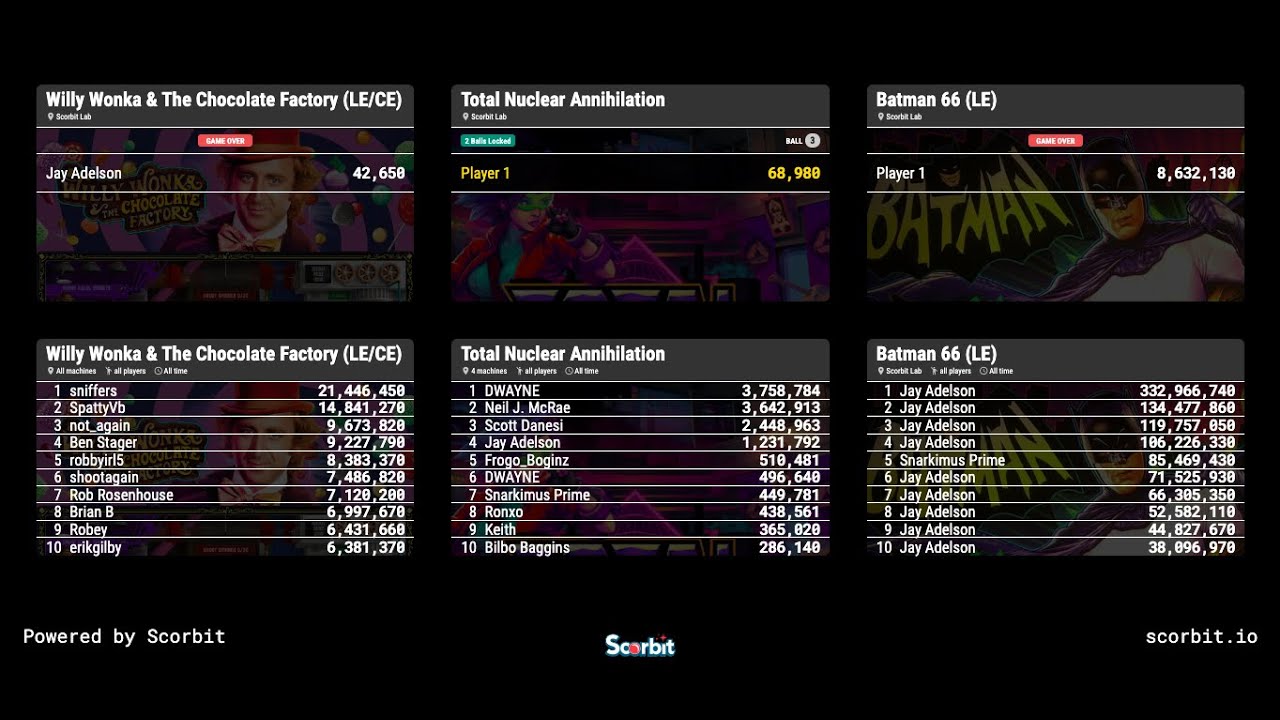 - All Time: This mode is perfect for a list of all scores ever recorded for a machine from the day it was connected to Scorbit. This list can exist even if the game is transferred to another account, and never lies.